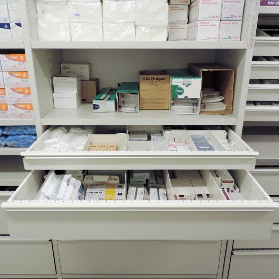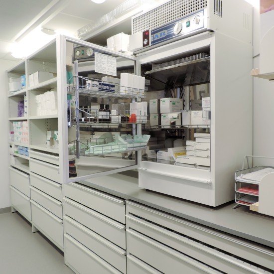 The clinic’s old-fashioned racking and shelving has been replaced with modern shelves and high-density flexible storage. The storage consists of drawers with internal dividers to accommodate stock of all shapes and sizes, with shelving above. If there is a requirement to keep medicines cold, the system can be designed to incorporate a cooling system. In this clinic, a cabinet with a security code and lock has been supplied to house-controlled substances.