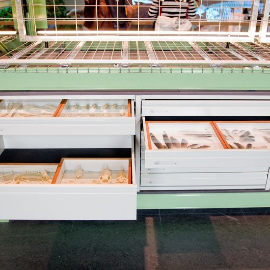 LiveScience shows a (small) part of Naturalis’s immense permanent collection of 42 million objects. From butterflies to beetles, from shells to snails, from loose bones to complete skeletons. Normally, the collection is safely stored in the museum’s twenty-storey depot tower. Visitors can browse part of the collection in LiveScience – thanks to the Bruynzeel drawer system. In the drawers, 256 glass-covered wooden “etiquette drawers” from Naturalis with museum objects have been placed in a precisely fitting manner.